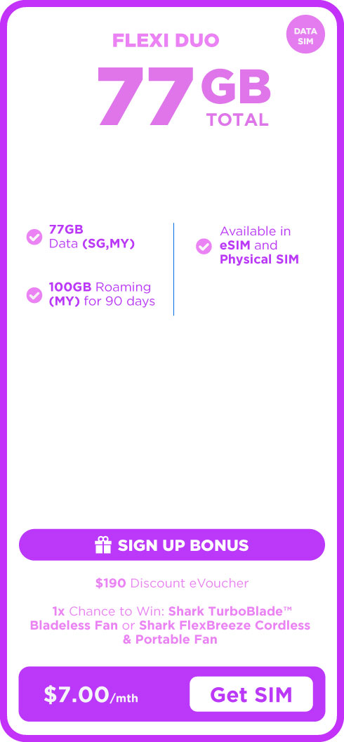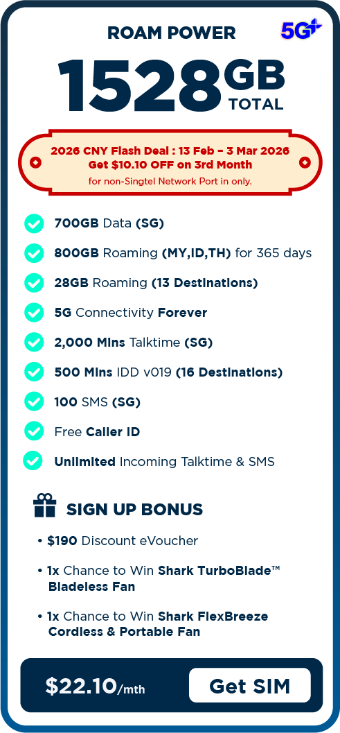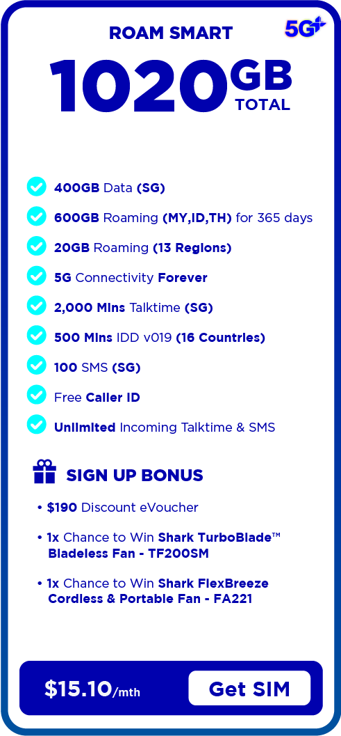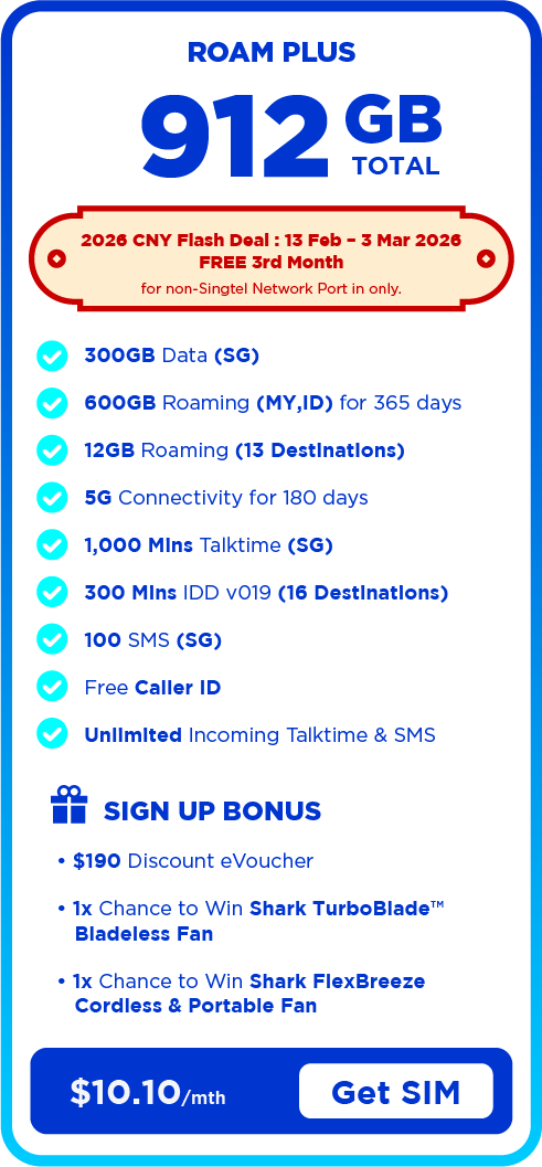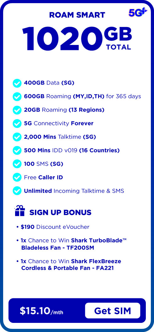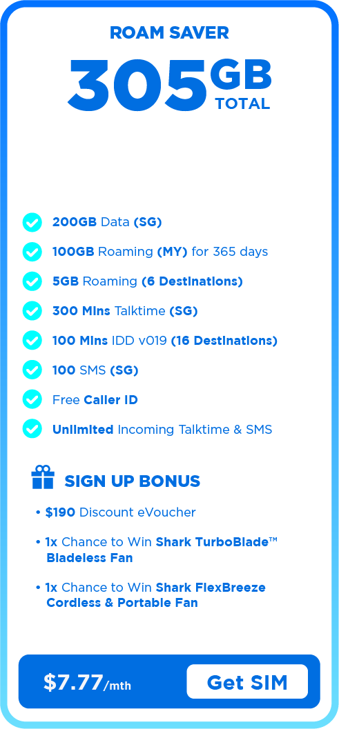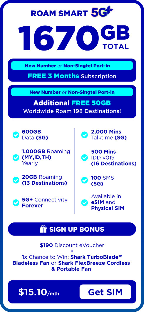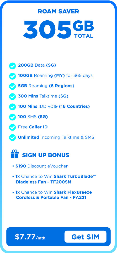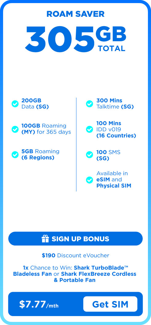 - [SIGN UP Lucky Draw Entry] All new subscriber who activate a new SIM card between 1 March to 30 June 2026 shall get 1x chance to win a Shark TurboBlade™️ Bladeless Fan, worth $499 and 1x chance to win a FlexBreeze Cordless & Portable Fan, worth $279. The winners shall be contacted via email, WhatsApp, or SMS for collection. Refer to T&Cs.