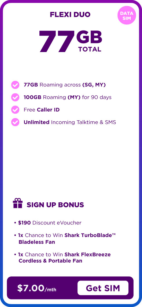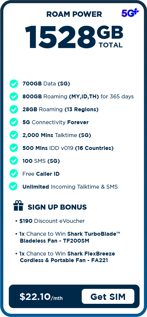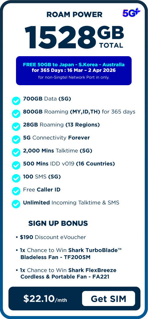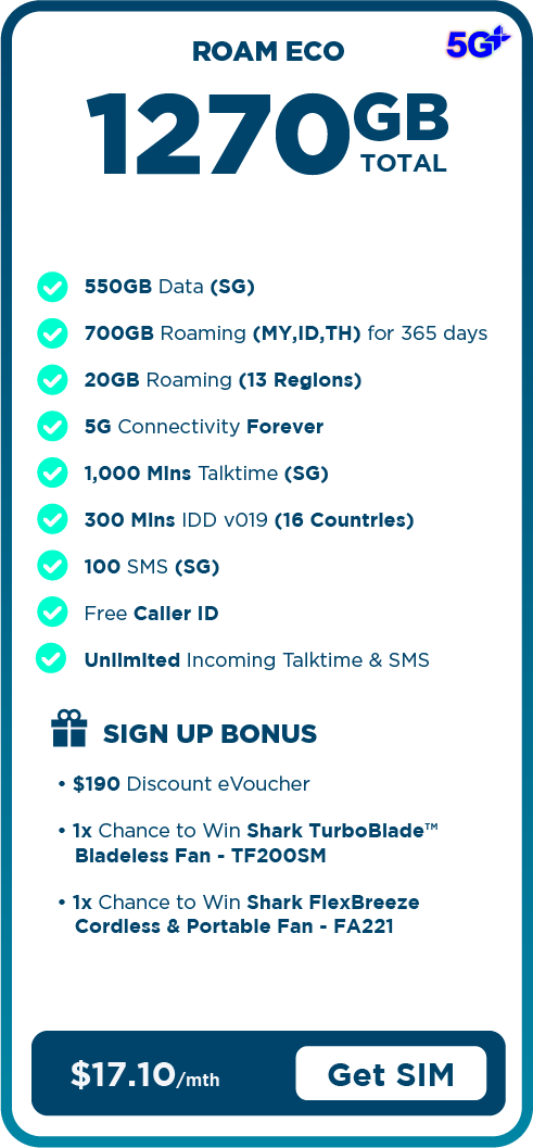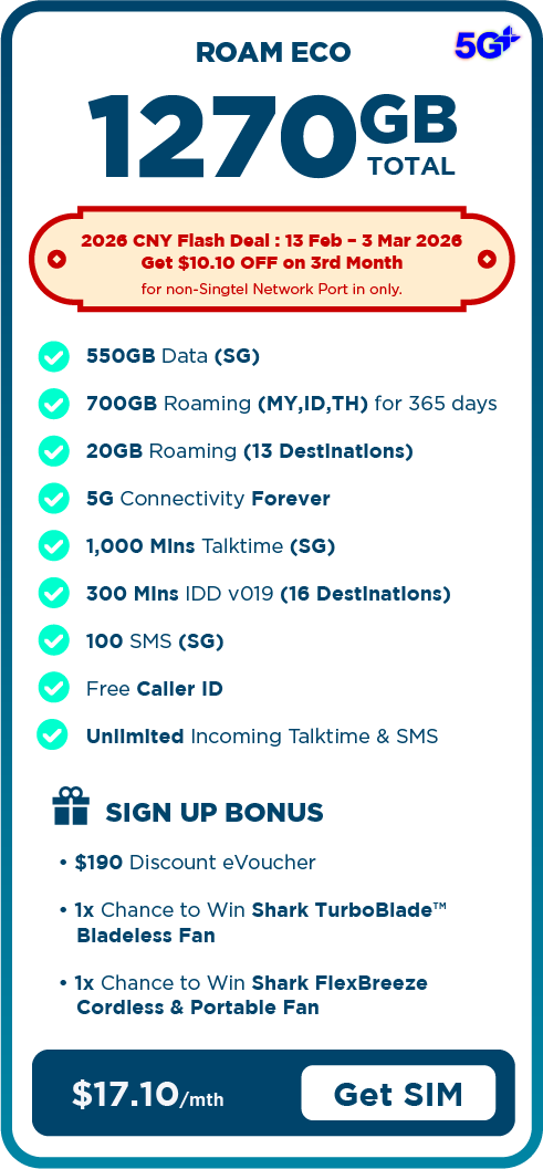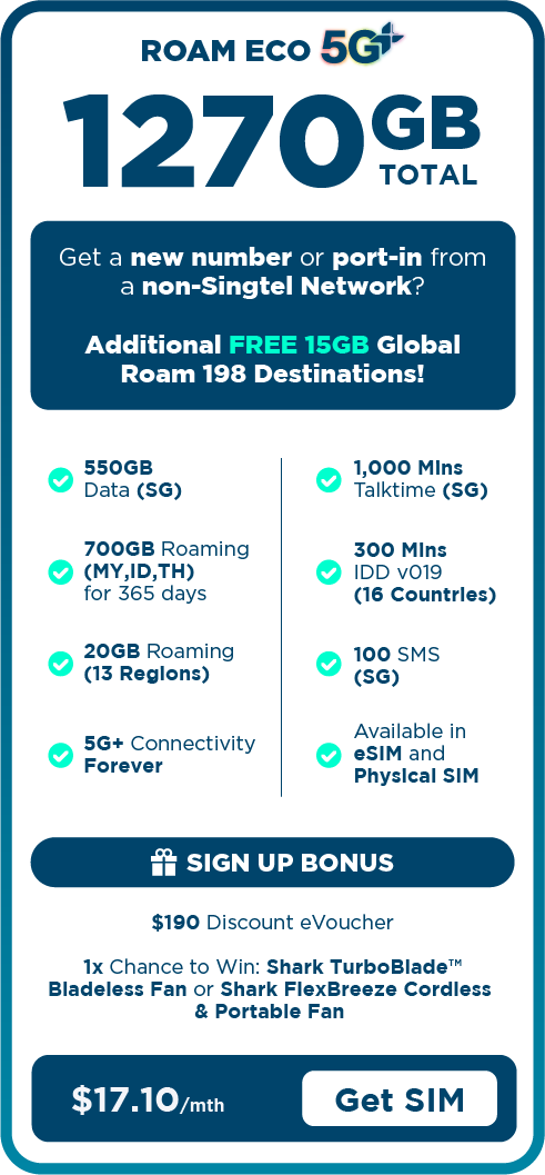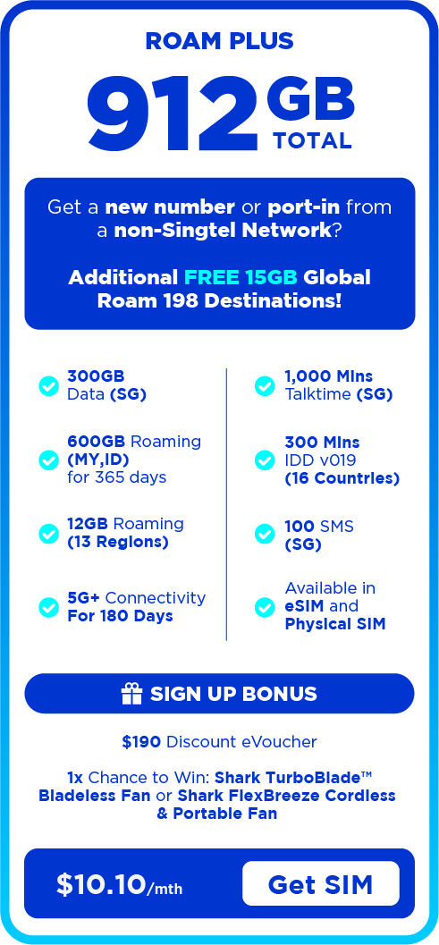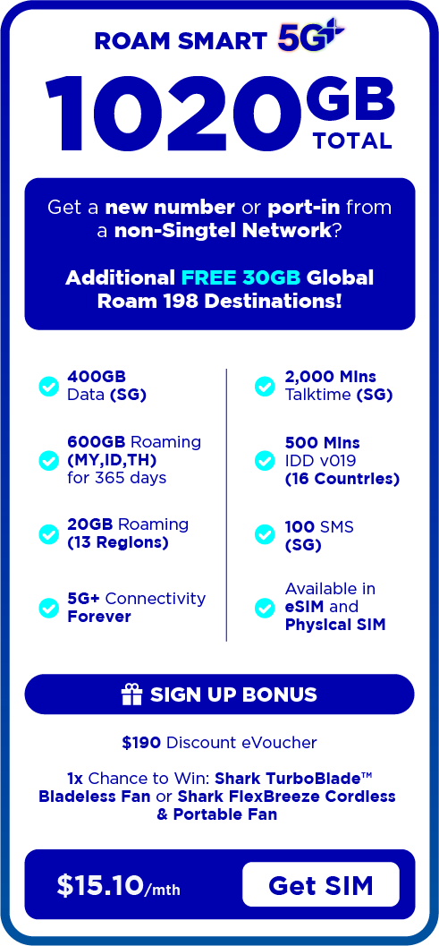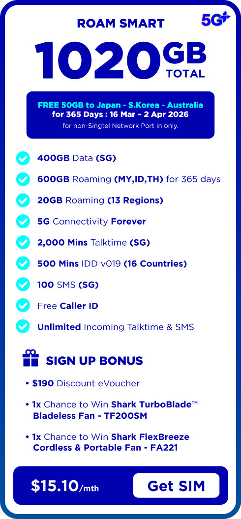 - [SIGN UP Lucky Draw Entry] All new subscriber who activate a new SIM card between 1 March to 30 June 2026 shall get 1x chance to win a Shark TurboBlade™️ Bladeless Fan, worth $499 and 1x chance to win a FlexBreeze Cordless & Portable Fan, worth $279. The winners shall be contacted via email, WhatsApp, or SMS for collection. Refer to T&Cs.